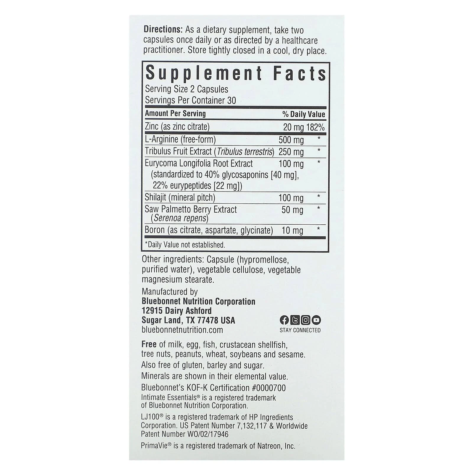 Features zinc citrate, free-form L-arginine, Tribulus fruit, Eurycoma longifolia (LJ100®), Shilajit (PrimaVie®), and boron.